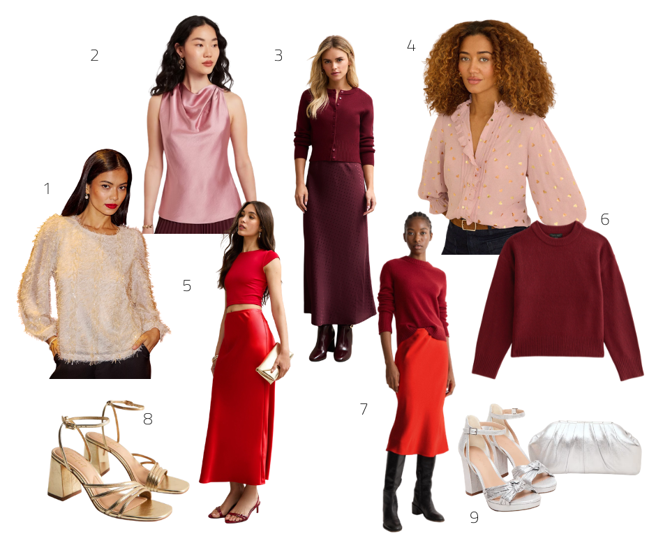 This combination feels romantic without being predictable. The mix of red and pink together feels modern and confident. But you could swap the pink top for a creamy fluffy jumper or maroon polo neck depending on your shape and colourings.